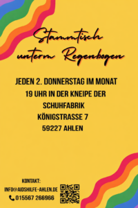 Treffpunkt für alle Queer/Trans*Personen von 18 bis 80+ jeden 2. Samstag im Monat von 14 bis 17 Uhr im Gruppenraum von Phönix Soest, Ulrichertor 4, 59494 Soest.